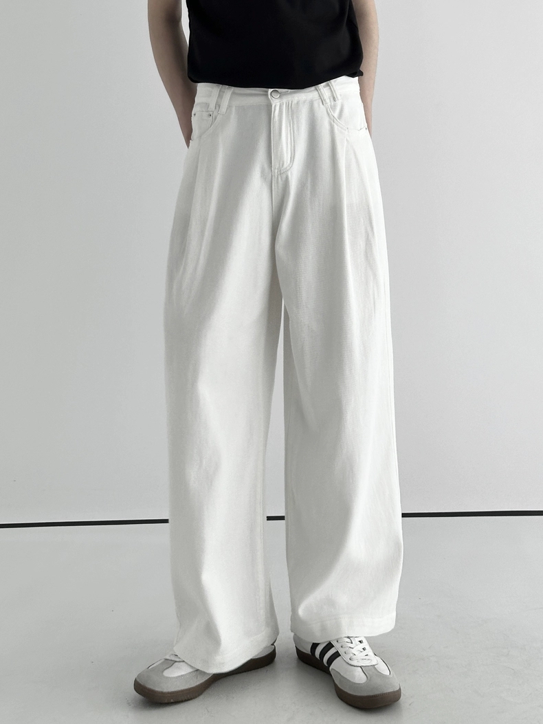 レディース向けの白パンツ。ハイウエストでゆとりのあるシルエットが特徴的。