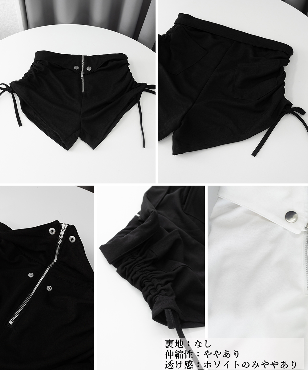 カラー:ブラック/ホワイト サイズ:M/L/XL/XXL [M]着丈:約30cm 股下:約6.5cm ウエスト:約63-71cm ヒップ:約86-96cm もも周り:約54-64cm [L]着丈:約31cm 股下:約6.5cm ウエスト:約66-74cm ヒップ:約88-98cm もも周り:約56-66cm [XL]着丈:約32cm 股下:約6.5cm ウエスト:約69-77cm ヒップ:約90-100cm もも周り:約58-68cm [XXL]着丈:約33cm 股下:約6.5cm ウエスト:約70-78cm ヒップ:約92-102cm もも周り:約60-70cm 裏地:なし 伸縮性:ややあり 透け感:ホワイトのみややあり