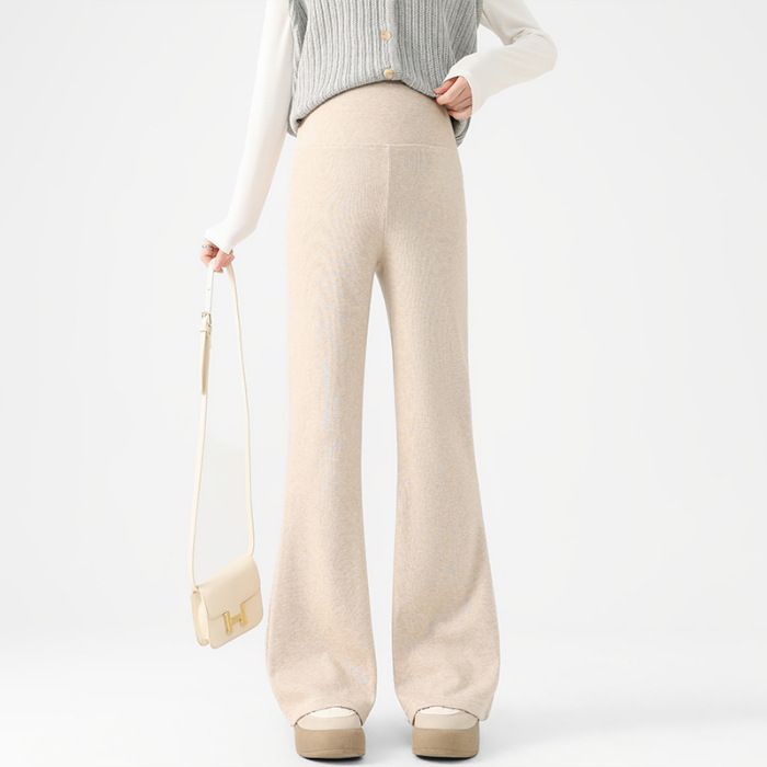 柔らかなリブニット素材で優しくお腹を包み込むマタニティ専用の白パンツです。 伸縮性のある幅広ウエストバンドが体型の変化に合わせてフィットし、締め付け感なく快適に着用できます。 裾に向かって広がるフレアシルエットが脚のラインを美しく見せ、妊娠中でもおしゃれを楽しめるデザインです。 カジュアルからきれいめまで幅広いコーディネートに対応し、産前産後も長く愛用いただけます。