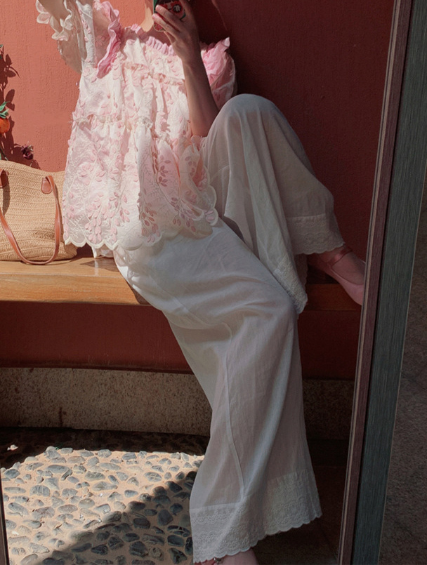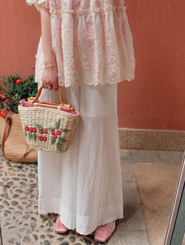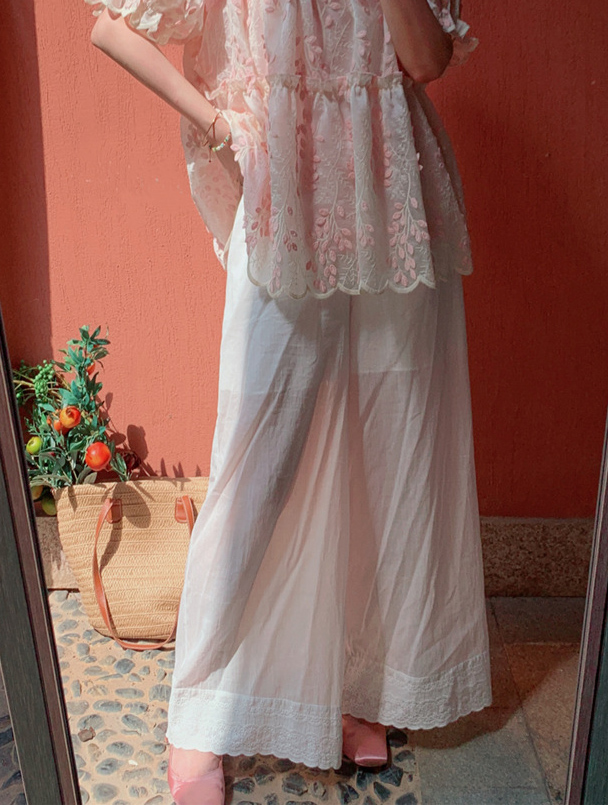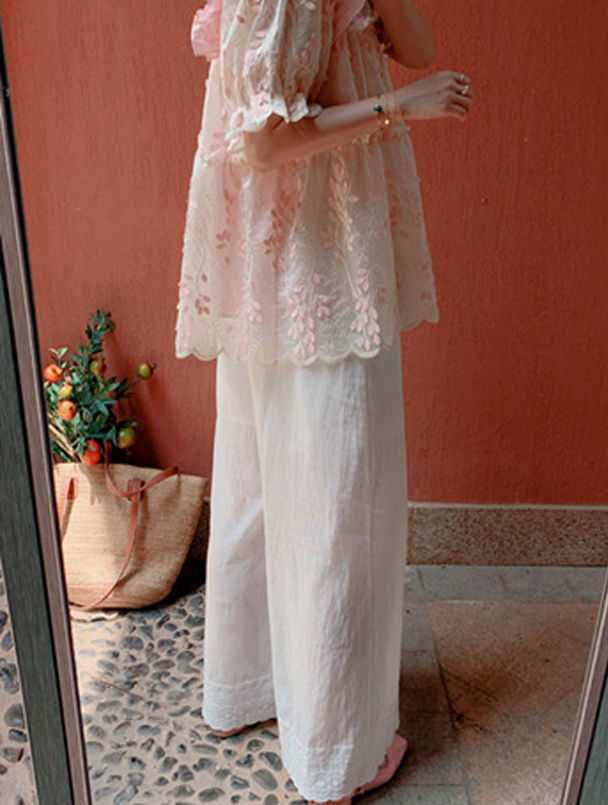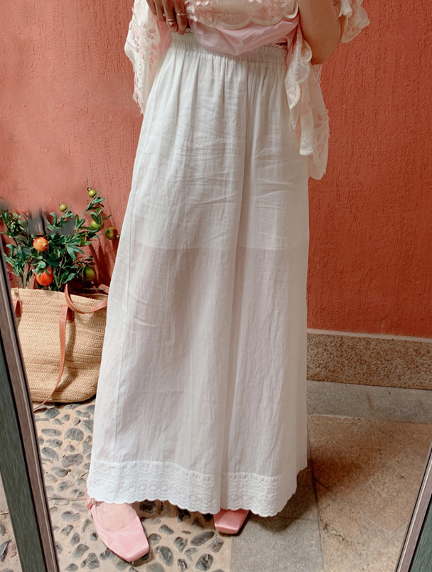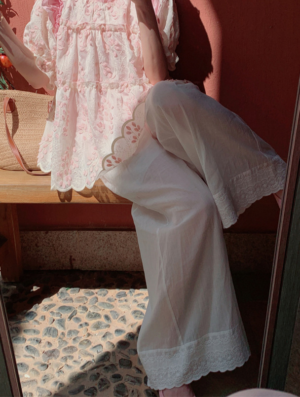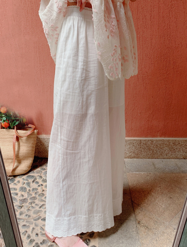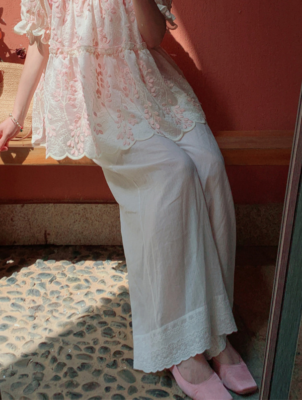 上品なレース裾が魅力的な綿混素材のワイドパンツです。