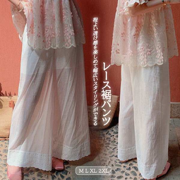 ■コメント ・軽量で涼しい綿混ワイドパンツです。 ・脚のラインを拾わず、太ももやお尻まわりもゆったり◎。 ・ウエストゴムで仕様で楽な穿き心地。 ・裾にレースを施し、女性らしさアップ。 ・程よい透け感を楽しめて幅広いスタイリングができます。 ■サイズ(単位:約cm) M 総丈94 ウエスト63-93 ヒップ102 L 総丈95 ウエスト66-97 ヒップ106 XL 総丈96 ウエスト69-101 ヒップ110 2XL 総丈97 ウエスト73-105 ヒップ114 ※平置き採寸の為、1-3cmの誤差がある場合があります。予めご了承下さいませ。 ■カラー 画像に記載 ■裏地 なし ■生地の厚さ 普通 ■透け感 あり ■素材 ポリエステル90%、綿10%